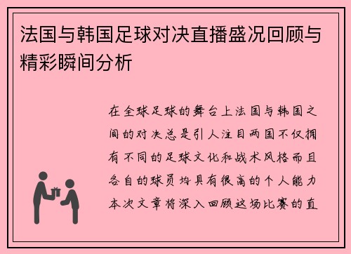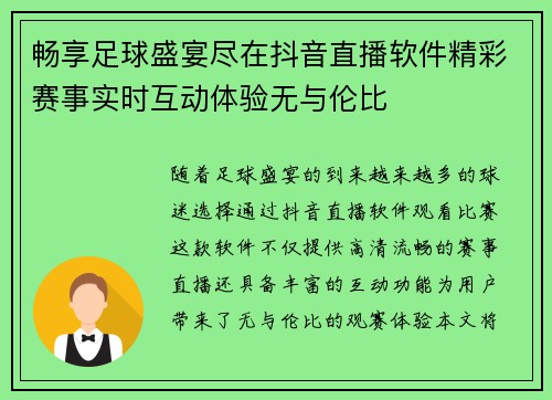 在现代体育赛事中,足球比赛以其激烈的对抗与丰富的战术变化成为了全球观众瞩目的焦点。本文将围绕“安永佳足球比赛直播视频精彩回顾与赛况分析尽在这里”这一主题展开,首先对近期的一场重要比赛进行精彩回顾,接着深入分析各队的战术布置及球员表现,然后探讨直播技术的发展对观看体验的影响,最后讨论如何利用这些赛况分...